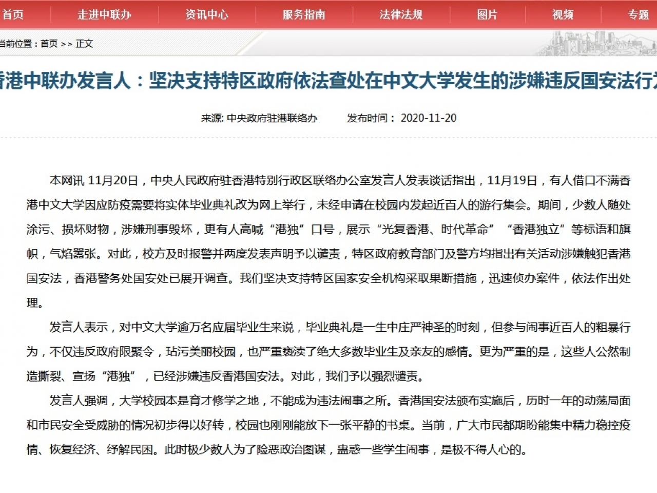 警方國安處派員到中文大學搜證。中聯辦強烈譴責中文大學昨日舉行網上畢業禮時,有畢業生在校內遊行。發言人說堅決支持特區國安機構採取果斷措施,迅速偵辦案件,依法作出處理。