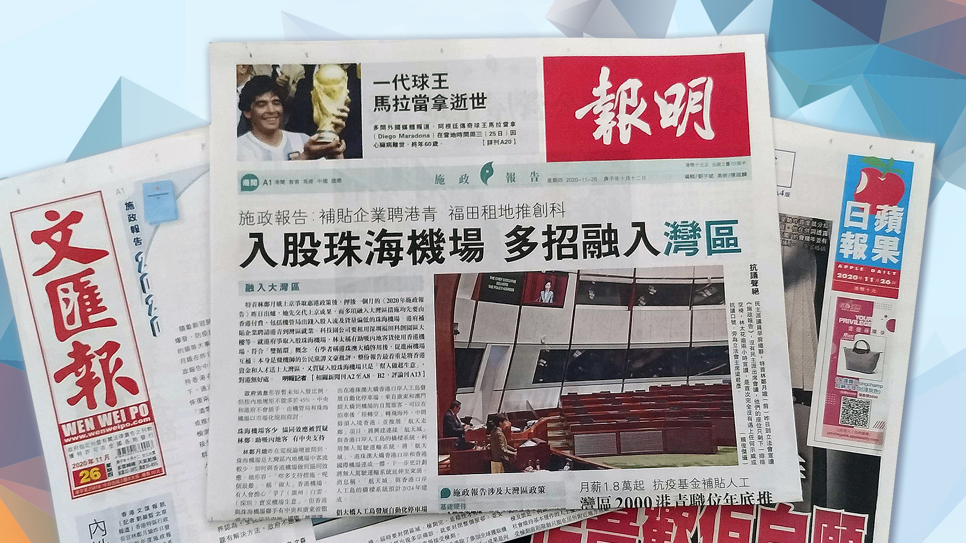 行政長官林鄭月娥遲來了一個月的《施政報告》昨天終於出爐。林鄭交代7項訪京成果,悉數圍繞中港融合發展。不論是香港上市的生物科技公司納入「互聯互通」,抑或入股珠海機場以鞏固香港國際航空樞紐地位,金融、創科、交通、經貿、防疫無一不與內地相關。商界歡迎香港主動融入國家發展大局,而泛民則批評林鄭未嘗試解開香港困局,又輸出本港資產和人才,指《施政報告》頓成「大灣區報告」。