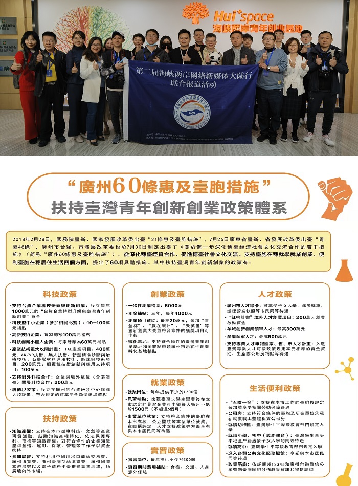 廣州「眾創五號空間」「廣州光機電研究院」和「廣州匯龍資訊產業園」等三個國臺辦授予的「海峽兩岸青年就業創業基地(示範點)」在當地引領形成了一批國家級、省級和市、區級的臺灣青年就業創業基地。據不完全統計,近三年廣州新增臺灣青年創業項目一百廿多個,新增臺灣青年創業、就業實習人員近兩千六百人,七十一位臺灣專業人士獲得廣州市「人才綠卡」。