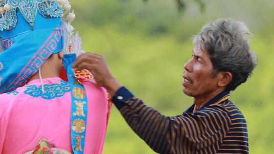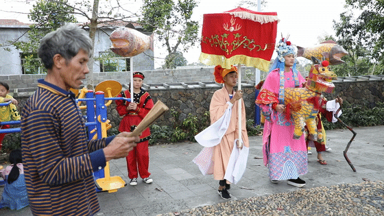 “麒麟铃铃,麒麟来,麒麟送子天门天,天门天……”与其他省份不同,海南麒麟舞舞队由7人组成,讲述“元帅”奉命,带“家院”和4名“天兵”来到尘世,由“土地爷”引导给人们送麒麟、送祝福,在一旁伴奏的乐师是海南八音弹奏组合。