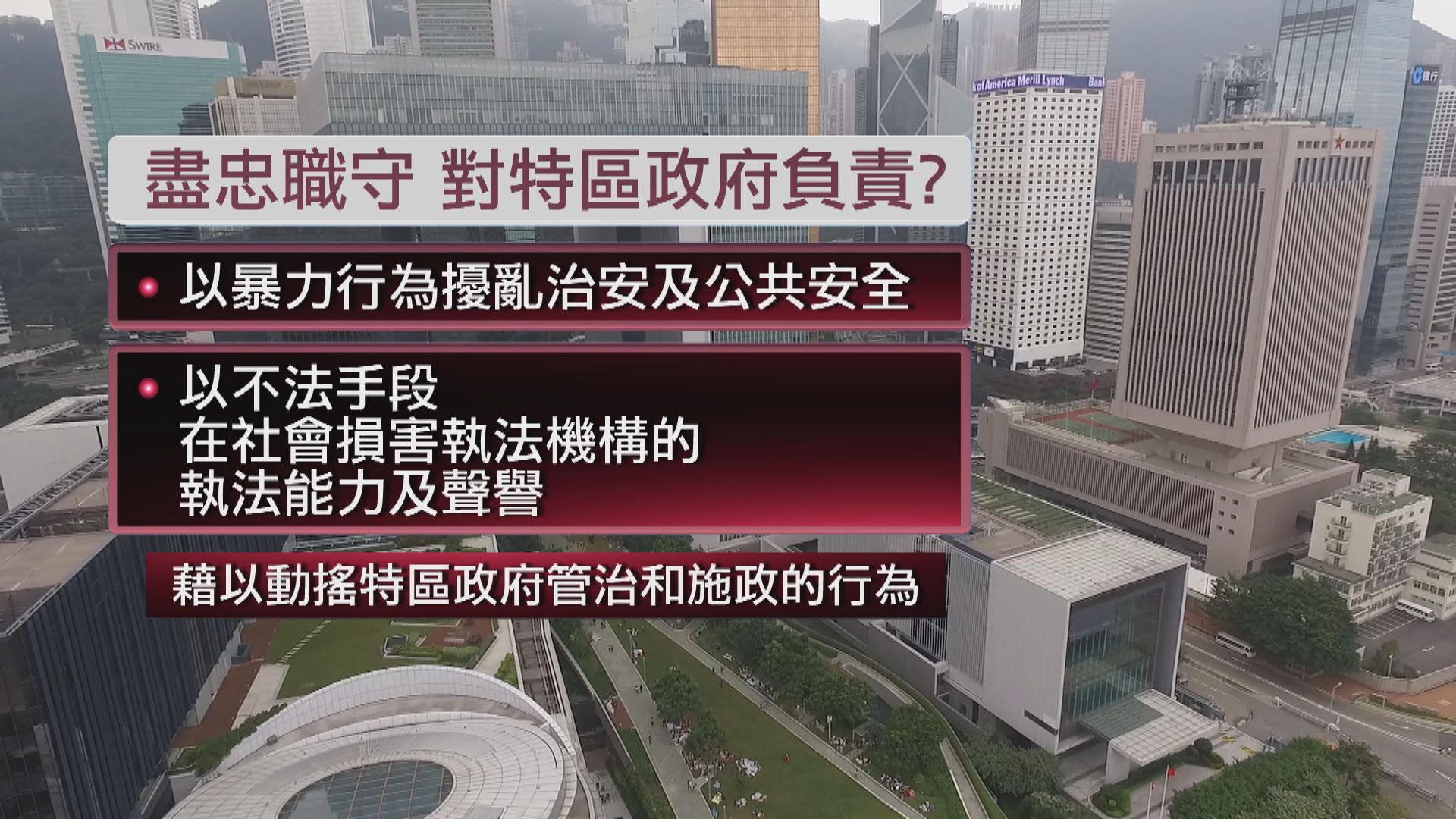 文件指以暴力行為擾亂治安及公共安全,以不法手段損害執法機構的執法能力及聲譽,藉以動搖特區政府管治和施政的行為,都屬違反誓言。