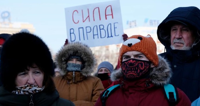 抗议活动在俄罗斯远东地区的城市拉开序幕,这些城市所在时区比莫斯科早几个小时。 纳瓦尔尼位于哈巴罗夫斯克(Khabarovsk,又名伯力)的地区办公室在推特上表示,示威活动开始后不久,数十名抗议者在该市被当局围捕。视频画面显示,抗议者顶着严寒高呼 “耻辱” 、”强盗”。 哈巴罗夫斯克的抗议活动也聚焦了当地前领导人弗格(Sergei Furgal)被捕一事。