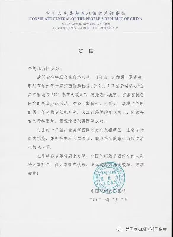 中国驻纽约总领馆黄屏大使、中国驻洛杉矶总领馆领侨处汤长安主任、美国国会议员孟昭文女士、美国国会议员赵美心博士、纽约州长库谟Andrew Coum、纽约州委员会委员黄敏仪女士、美国洛杉矶圣盖博市市长廖钦和先生、美国南加州华人联合总会会长邵闻先生、美国南加州江西同乡会前会长法律顾问李斌律师、美国大西北总商会会长江风年会长等为此次活动的美国祝贺嘉宾。清华大学南加校友会会长罗重阳博士 于2021年2月3日发来贺函。