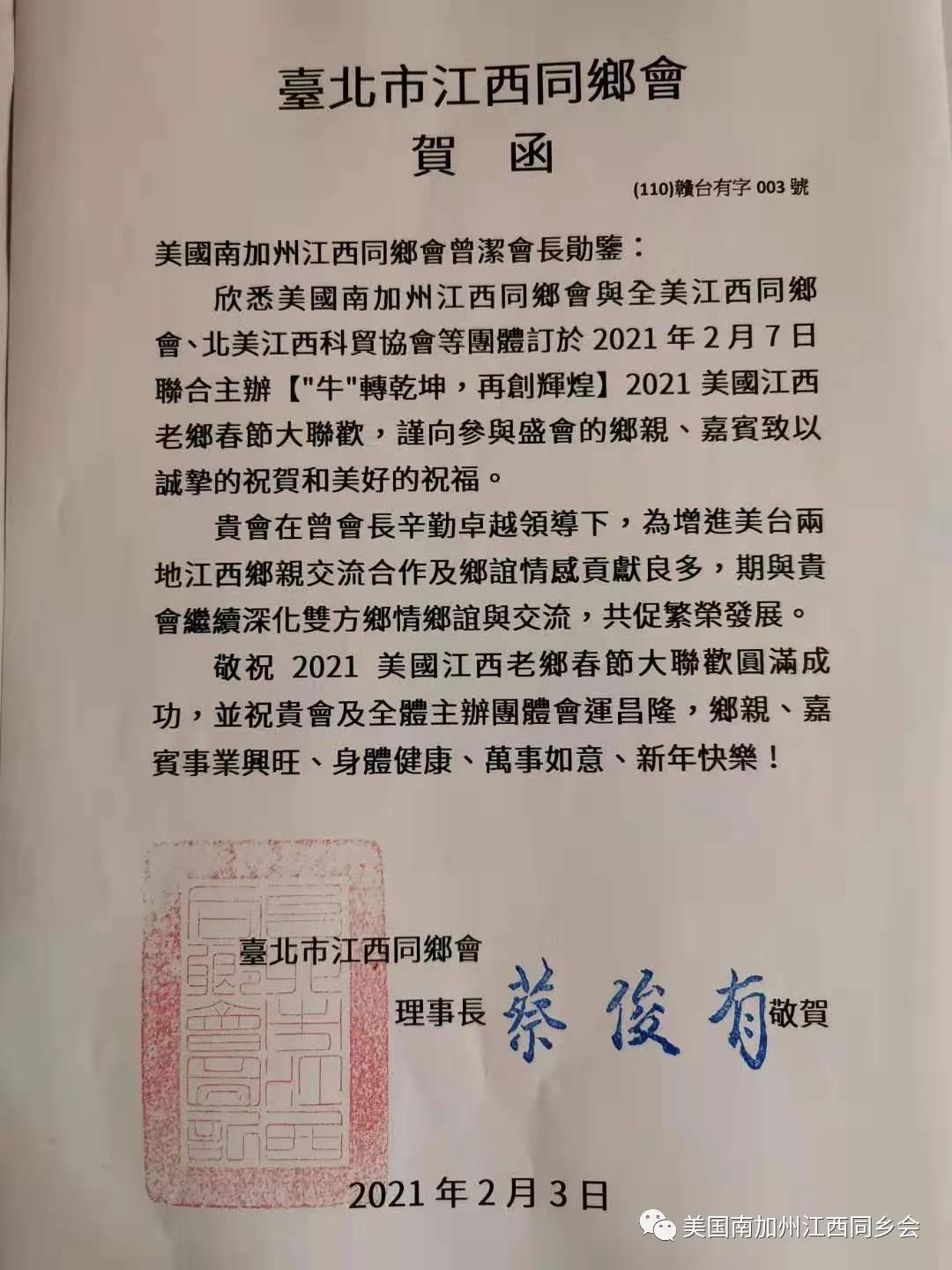 据了解,美国南加州江西同乡会在洛杉矶创办于1994年,经过历任会长的努力已走过了27个春夏秋冬,她是美国南加州历史最悠久、规模最大、在加州州政府正式注册的非盈利组织,同乡会在曾洁会长的带领下,蓬勃发展, 2019年成功举办了25周年庆典,2020在疫情爆发后,发动老乡积极为家乡筹集善款3万多美金。年长的会员荣升荣誉顾问,不遗余力培养年轻德才兼备的赣籍学子,博士过百人,曾会长非常用心办好自己的会务,为家乡建设做好桥梁工作,同时也不忘与兄弟会联谊,2018年率领同乡会代表团访问了台湾,先后与台北市江西同乡会蔡俊有会长、江西省旅台同乡会总会黄玠会长及理事们进行了亲切友好座谈。