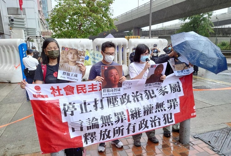 他們聲援內地詩人王藏及妻子王麗,兩人涉嫌煽動顛覆國家政權罪,案件會在雲南楚雄州中級法院審理。團體要求釋放兩人,並聲援失蹤超過三年的維權律師高智晟,要求中央政府交代他的下落;抗議人士在現場拉起橫額及叫口號後散去。