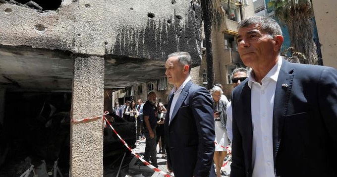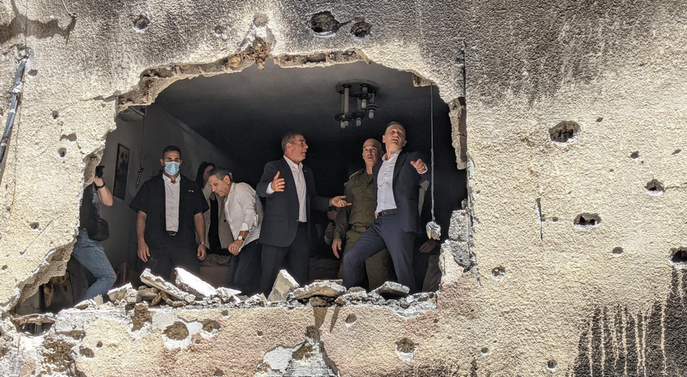 德国外交部长马斯与以色列外交部长加比-阿什肯纳齐一起参观了一座被火箭弹击中的房屋