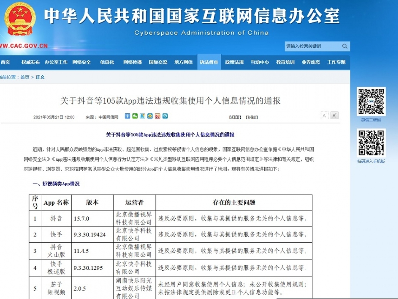 在北京,國家互聯網信息辦公室表示,抖音在內的105款軟件程式,涉嫌違法違規收集使用個人數據,要求15個工作日內完成整改,逾期未完成將依法,予以處置。