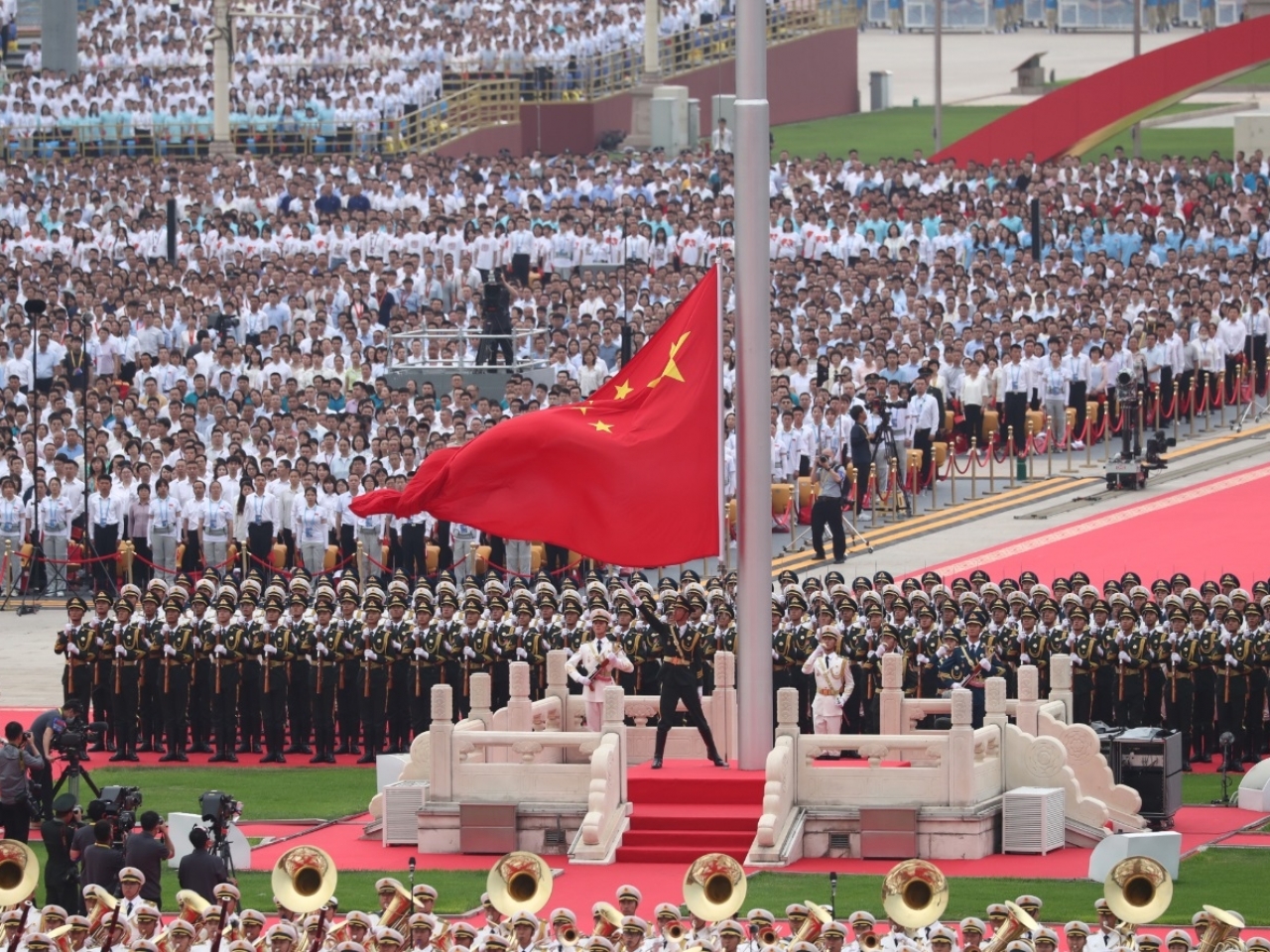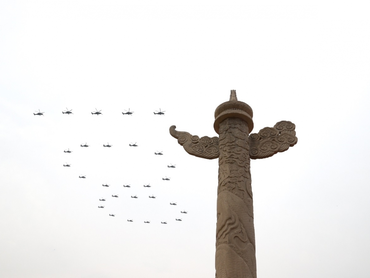 中共總書記習近平、總理李克強與其他中央政治局常委、前國家領導人胡錦濤、溫家寶等人步上天安門城樓,「直-10」直升機隊飛越天安門上空,掛上中共黨旗及慶祝標語,排列出「100」隊形,「殲-10」機隊則排列出「71」隊形,15架隱形戰鬥機「殲-20」公開亮相,機隊排列成「人」字隊形。