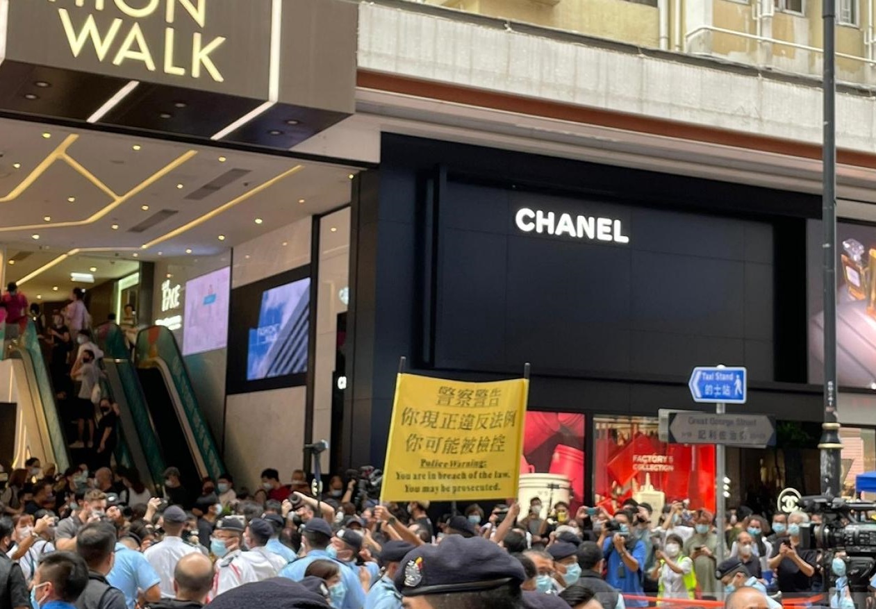 有市民在商場門口叫口號,警員舉起黃旗警告。數名警員先進入商場,大批警員緊隨其後,拉起橙帶,要求在場人士離開,守著商場門口。一段時間後,有警員突然追截一名少年,跑入商場店舖,將他帶到街上查問後放走。
