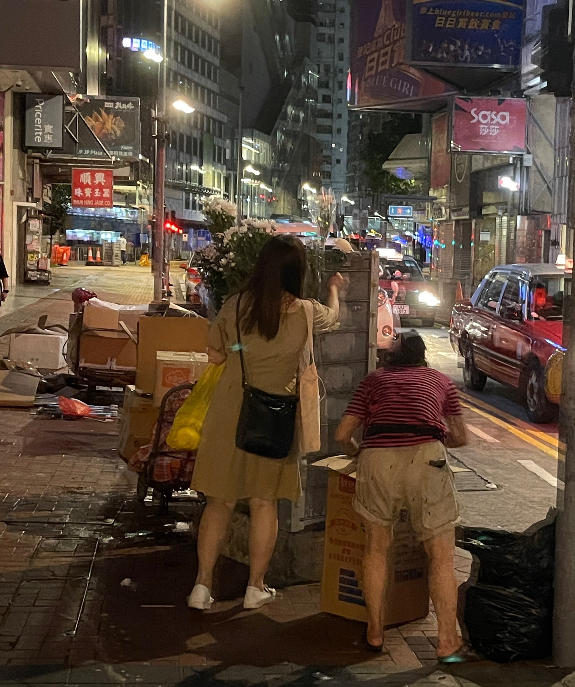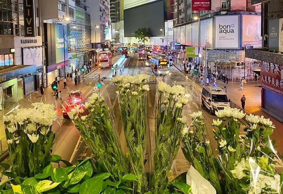 周五(2 日)晚上周六( 3日)凌晨,在接近崇光百貨的核心範圍,鮮花都會被清走,有市民則在「核心外圍」,包括怡和街圓形天橋、東角道、謝斐道的路旁,放下鮮花悼念。警員截查部分身穿黑衣的市民,又查看他們的隨身物品,有大批警員戒備。