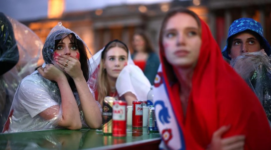 英格兰队倒在点球大战,英格兰球迷表情凝重。