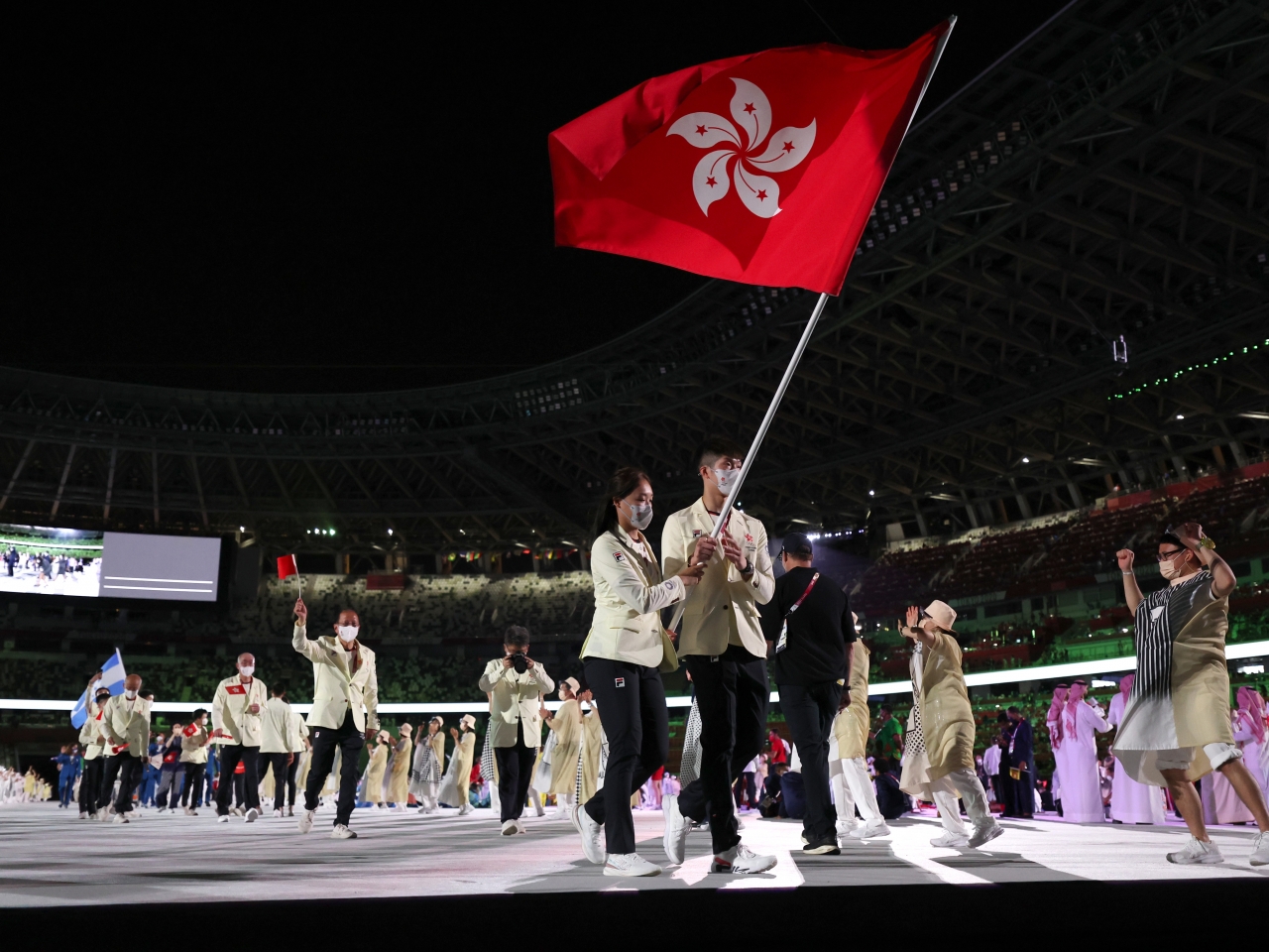 總共431人參賽的國家隊,女排代表朱婷和跆拳道的趙帥擔任持旗手,率領國家隊代表進場。香港隊就派出46位運動員,由劍擊隊的張家朗及羽毛球隊謝影雪擔任持旗手,帶領港隊進場。
