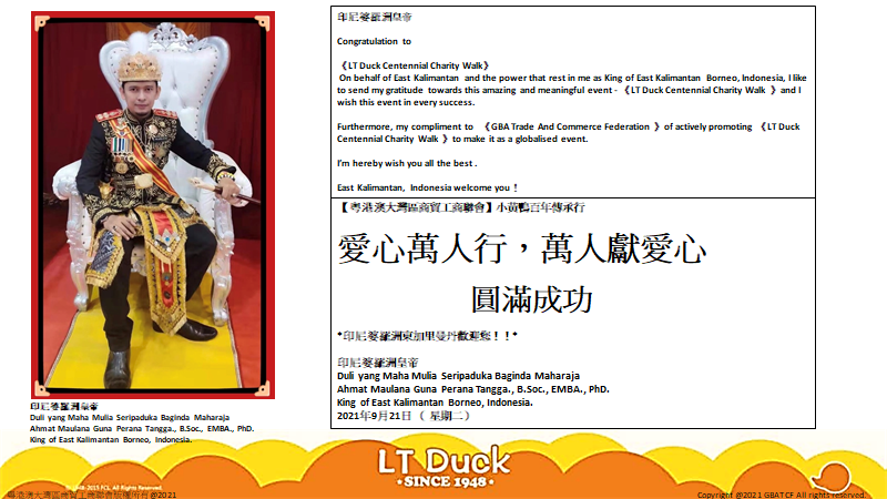 据悉,粵港澳大灣區商貿工商聯會 《 小黃鴨百年傳承行》 己獲得印尼婆羅洲皇帝、 印尼婆羅洲總理、 斯洛文尼亞科巴里德市副市長的大力支持并發來了視頻賀電 ,《 小黃鴨百年傳承行》將於2021-9-22中秋節啟動。 希望能成為每年全球華人各地的城中大事。
