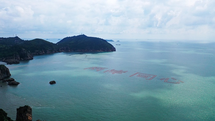 洞頭半屏山前,「兩岸同心」四個字浮於的海上,盼架起溫臺同心橋。(作者:李華春)