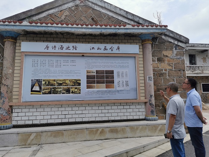 溫州洞頭臺辦主任張海山向中國新聞社浙江分社社委、中國新聞網浙江分網執行總裁汪恩民介紹鋼筆畫大師侯傳芳先生巨幅長卷《八百里甌江》(四十米)、《兩岸半屏山》(廿四米),總耗時三年半完成的曠世巨作,將在今年兩岸雙屏論壇展出,讓台灣看到溫州願「合屏」.(作者:蕭雲集)