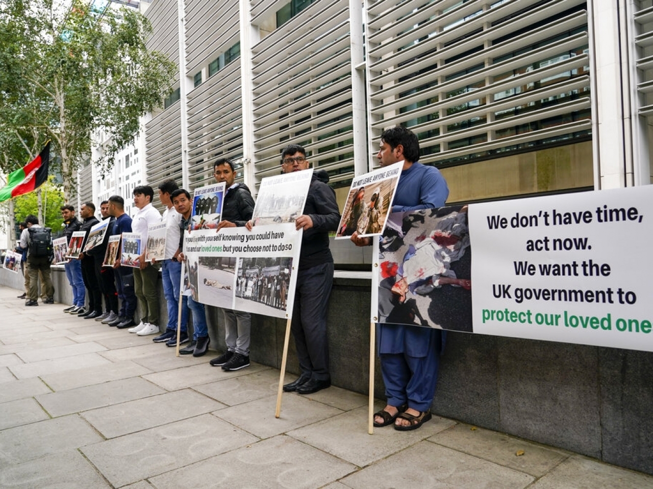 有民眾在位於倫敦的英國內政部外請願,要求政府盡力進行撤離行動。(美聯社)
