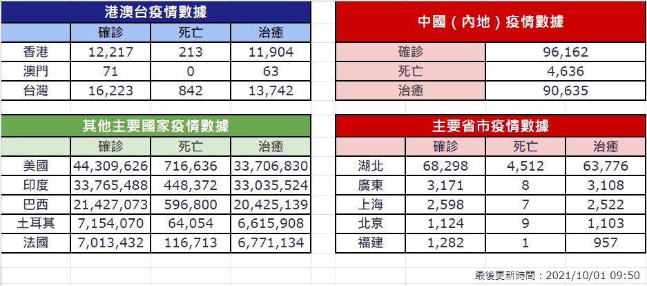 (中華時報/華聞社香港10月1日綜合報導)美國約翰霍普金斯大學(Johns Hopkins University)網站追蹤數據顯示,截至香港1日上午7時,全球至少477萬9778人病逝於COVID-19,至少2億3363萬2658人確診。