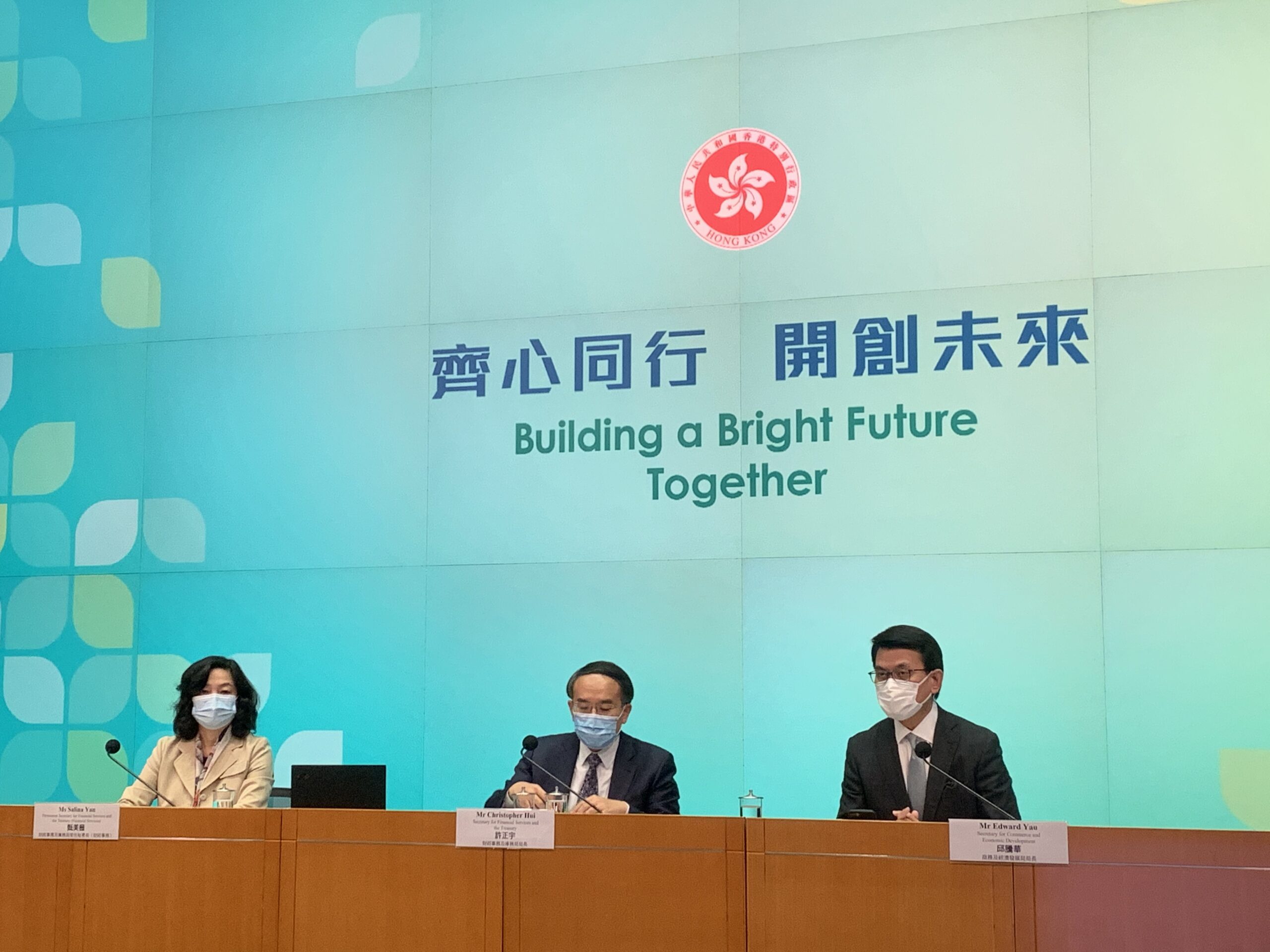 (中华新闻通讯社记者王经纬10月7日香港讯)香港商务及经济发展局局长邱腾华、财经事务及库务局局长许正宇、财经事务及库务局常任秘书长(财经事务)甄美薇在政府总部出席《施政报告》记者会,介绍《行政长官2021年施政报告》中其政策范畴的相关措施。
