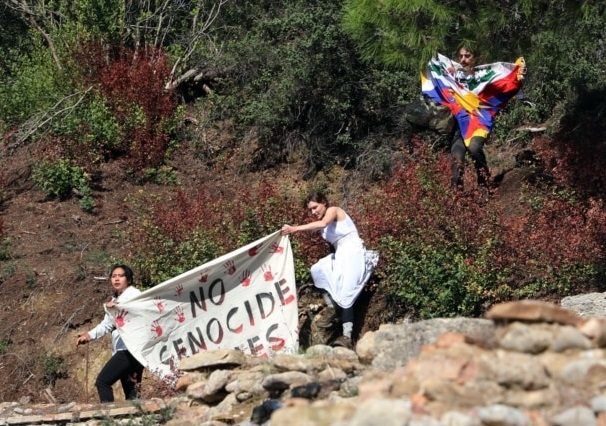 在扮演赫拉女神廟的“高階女祭司”點燃聖火火炬幾秒鐘後,這些抗議者展開一幅寫有“不要種族滅絕奧運”的橫幅和一面自由西藏的旗幟,並呼喊抵制北京冬奧會的口號。在他們試圖接近聖火火炬時,遭到警察的攔截拘捕。