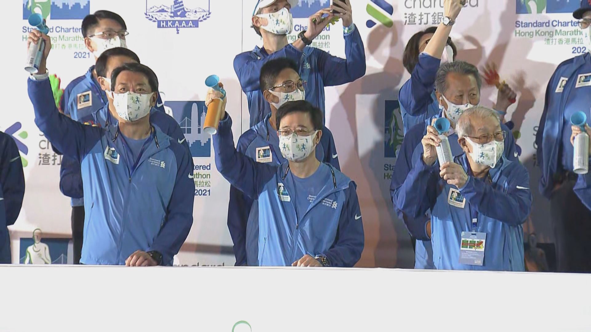 香港停辦一年的「香港馬拉松」今日舉行,第一組起步的是半馬精英組於清晨5時45分開跑。署理行政長官李家超主持起步禮。