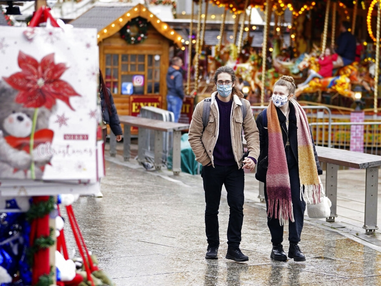 英格蘭民眾參觀聖誕市集時都戴上口罩,防範疫情。(美聯社)