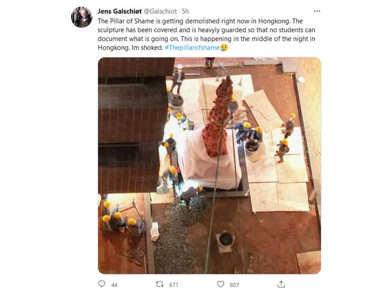 香港大學深夜拆除校園內的「國殤之柱」,並移送至位於林錦公路的港大嘉道理中心。港大校委會本科生代表黃靖軒說,校委會昨日投票通過有關決定,但當時沒提及何時移除,沒有想過昨晚已採取行動,認為校方決定倉卒。雕像創作人、丹麥雕塑家高志活在Twitter貼文,對港大校方在深夜移走「國殤之柱」感到震驚。