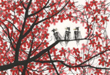 三幅「口罩」人物肖像,栩栩如生,其中一幀描繪的是畫家廖井梅,雖口罩遮蓋著臉龐,卻一眼就能認出,盡管行筆有些隨性,仍可見畫家捕捉人物個性的筆墨功力,筆落神到。