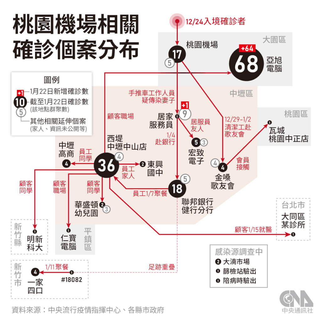 中央流行疫情指疫情指揮中心指揮官陳時中22日宣布,國內新增82例COVID-19本土病例,再創今年新高,包括高雄港14例、桃園亞旭公司64例,另外台北市、新北市也各新增1例及其他零星個案,防疫措施將升級;境外移入增48例,無死亡個案。