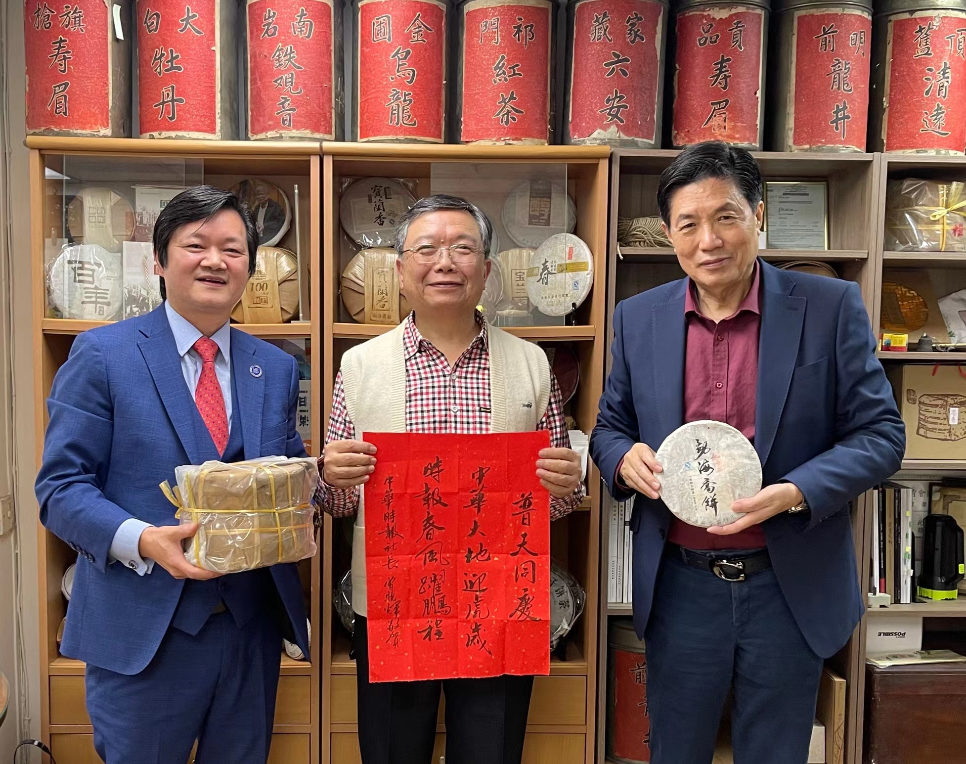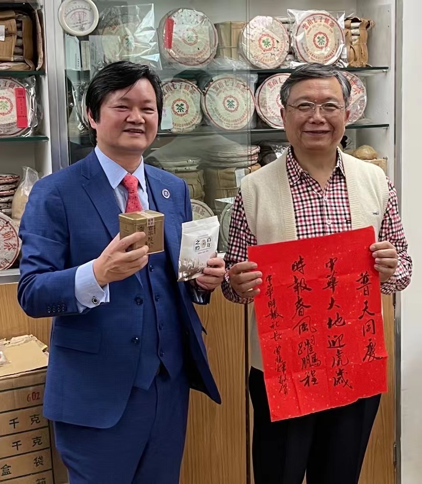 隨後,我們互贈禮物,他贈送陳年老茶,我贈送給他一張小春聯,參加品茶論道還有香港兩岸客家聯會會長江全孚、茶商施小姐,江會長帶來了香港名店的潮州卤水名菜,茶商施小姐下廚做了豆腐鯪魚湯和鹽水菜心,开心一起品嚐美食、喝起茶來⋯⋯