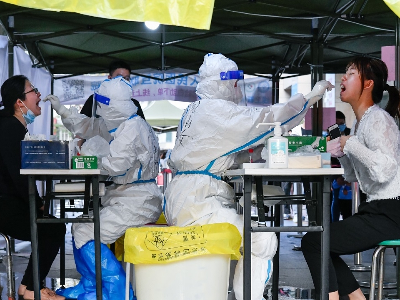 在深圳羅湖向西村核酸檢測點,當局派人為居民進行核酸採樣。(新華社)