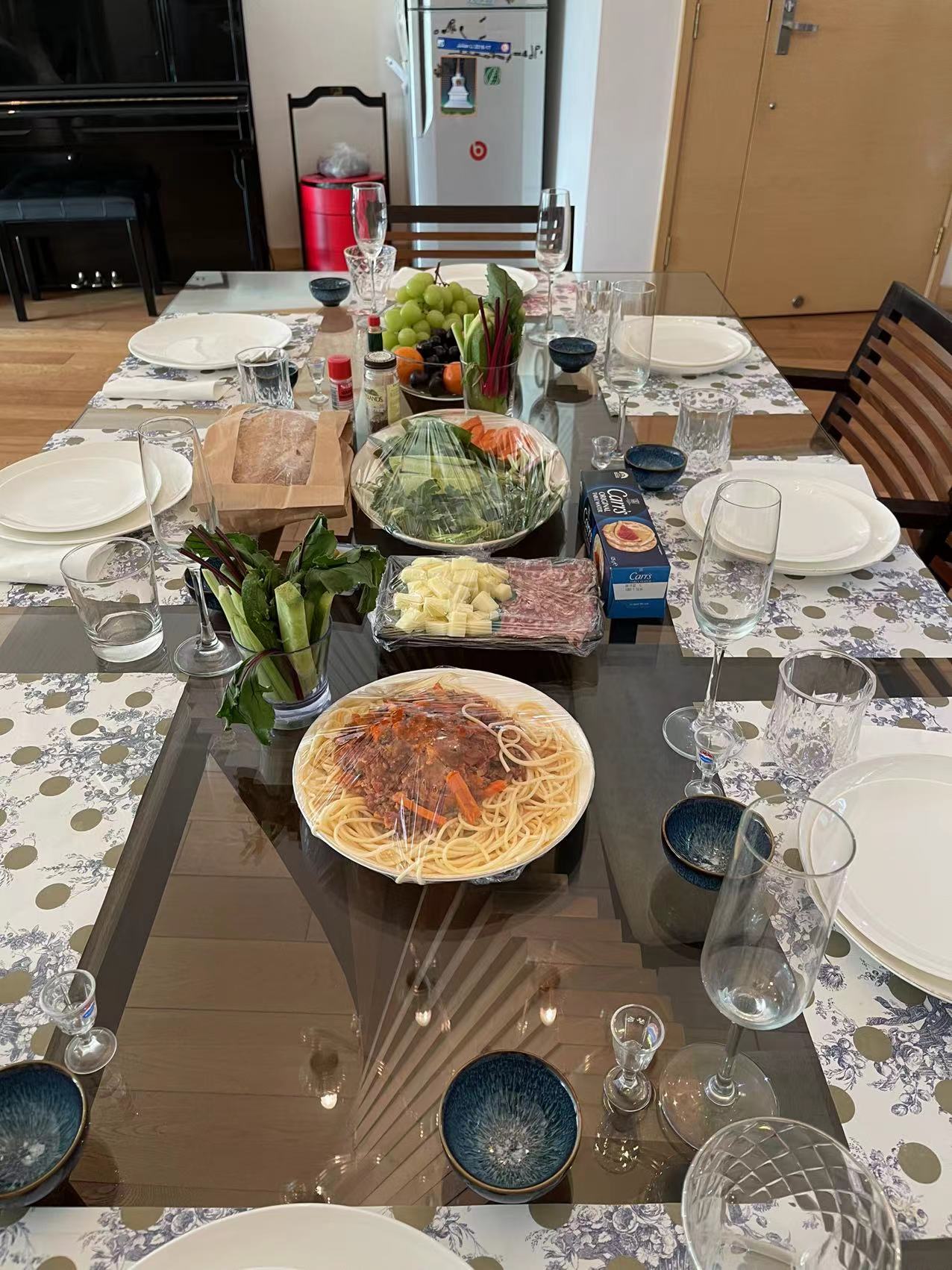 晚上,古箏演奏藝術家邀請我們到她家餐聚,她準備各式菜餚還亲手做東北合子,來自新疆西華兄(香港上市公司主席)帶來了鍋盤及新疆的麵粉做起饅頭,香港云浩先生帶來了好酒,香港珠海學院張教授,她也是紅樓夢專家,她也帶來她近期出版的書,我贈送一張去年就承諾浩雲先生寫好的書法給他(去年有次餐聚後,他要我寫他的座左銘“舍得”);我們在鋼琴演奏家海倫及古箏演奏家倫倫博士演奏經典之作時,我們的心及身體就聚在一起,紀念各自的祖先,也各自祝福各奔更好前程。