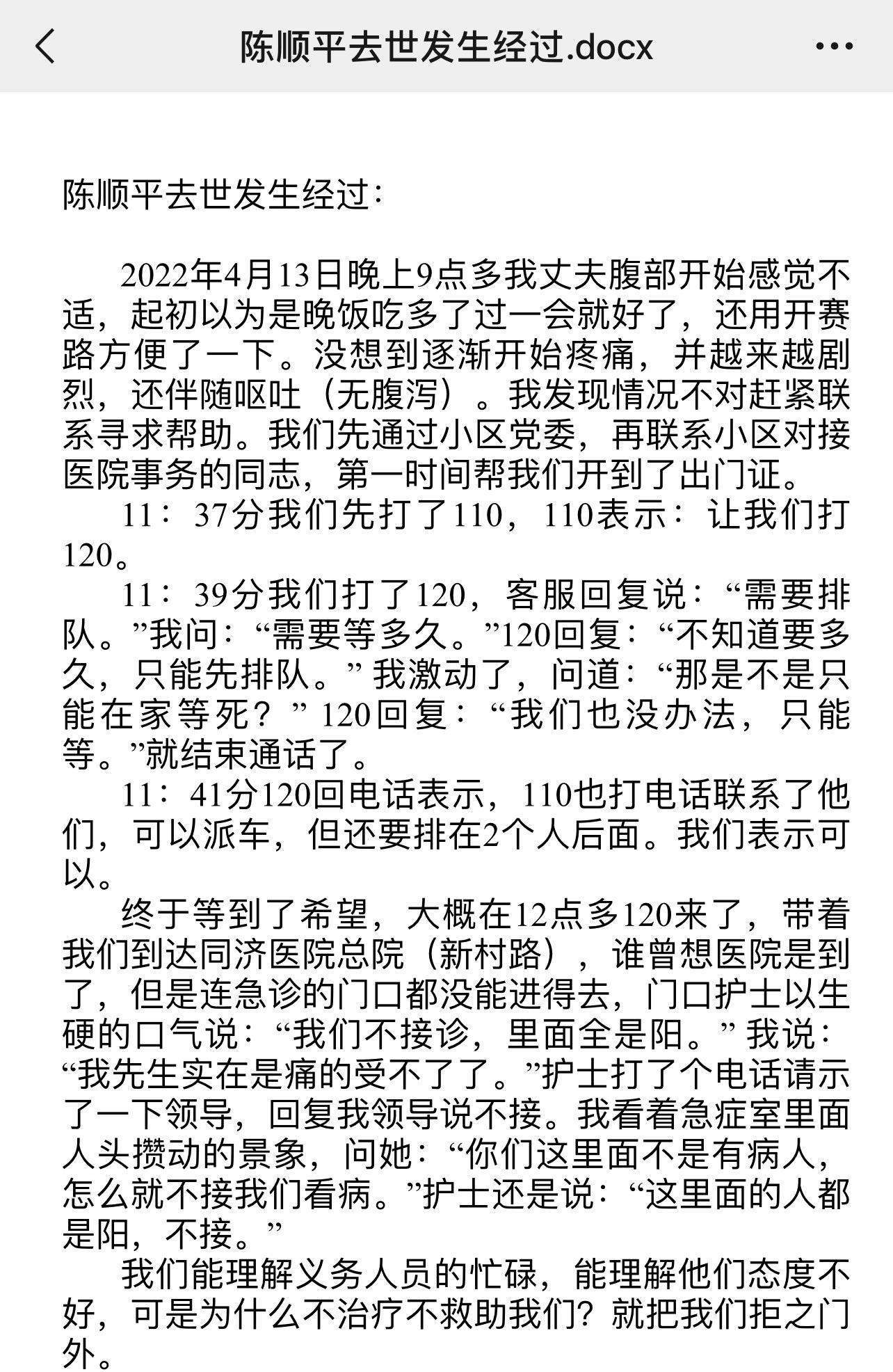 丈夫死後,同濟醫院的急診醫生說,「昨天晚上是有陽,但是消殺後還是接診的。」