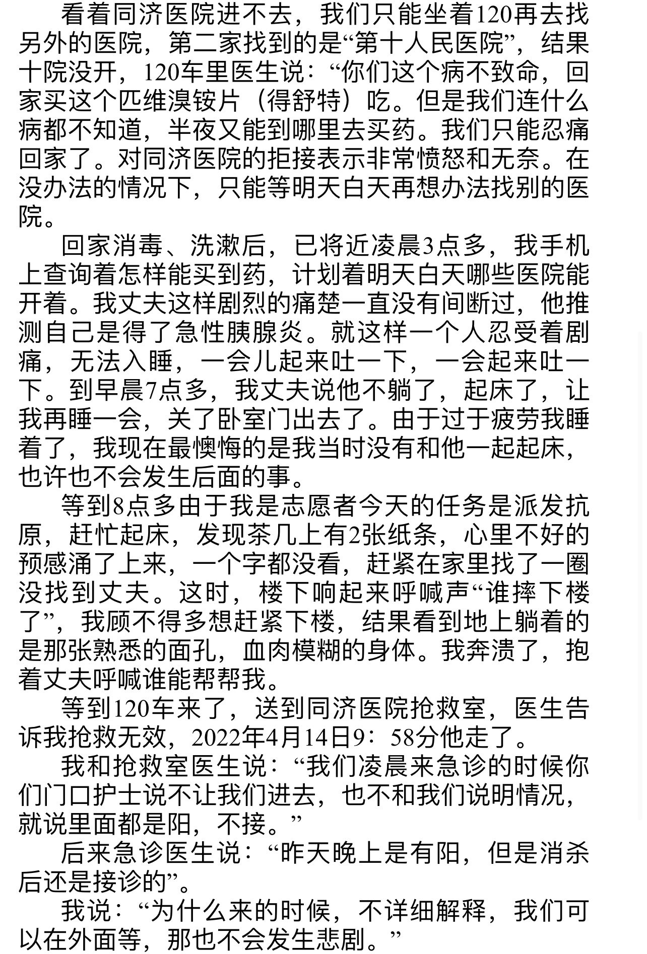 她表示,「我丈夫71歲,生前沒有什麼基礎病,13號晚上他到底生了什麼病,是什麼樣的劇痛,什麼樣的絕望,讓他走上了這條路。我們永遠都不可能知道了。這個社會活生生的把一個最普通的病人逼死了。」