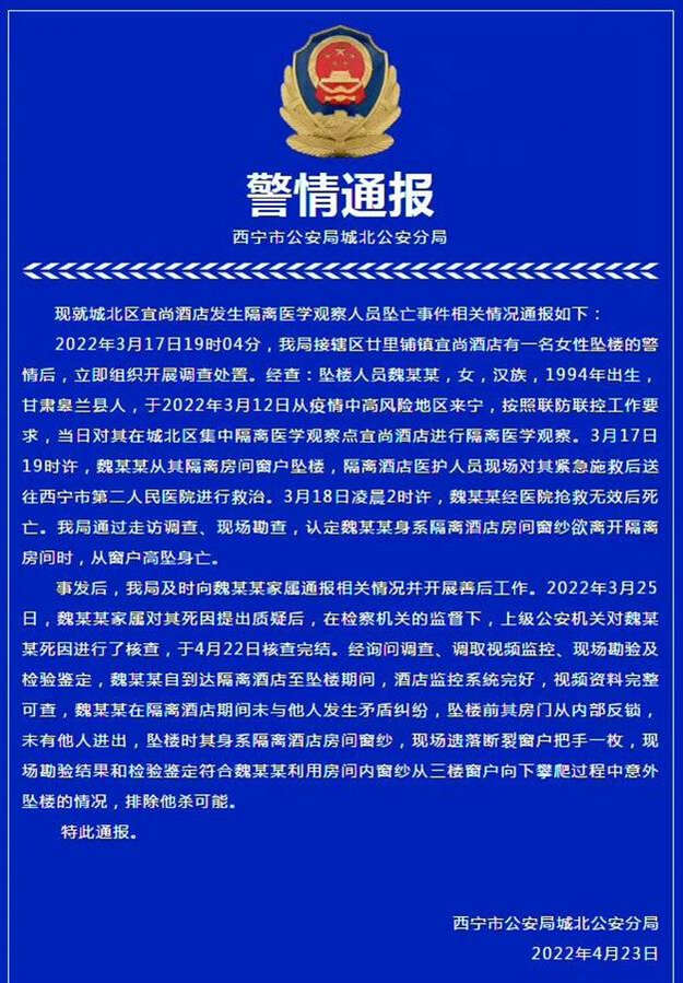 西寧城北區公安回應指出,現場勘查,認定魏某金霞是身系隔離酒店房間窗紗,欲離開隔離酒店房間時,意外從窗戶高墮身亡。排除他殺可能。