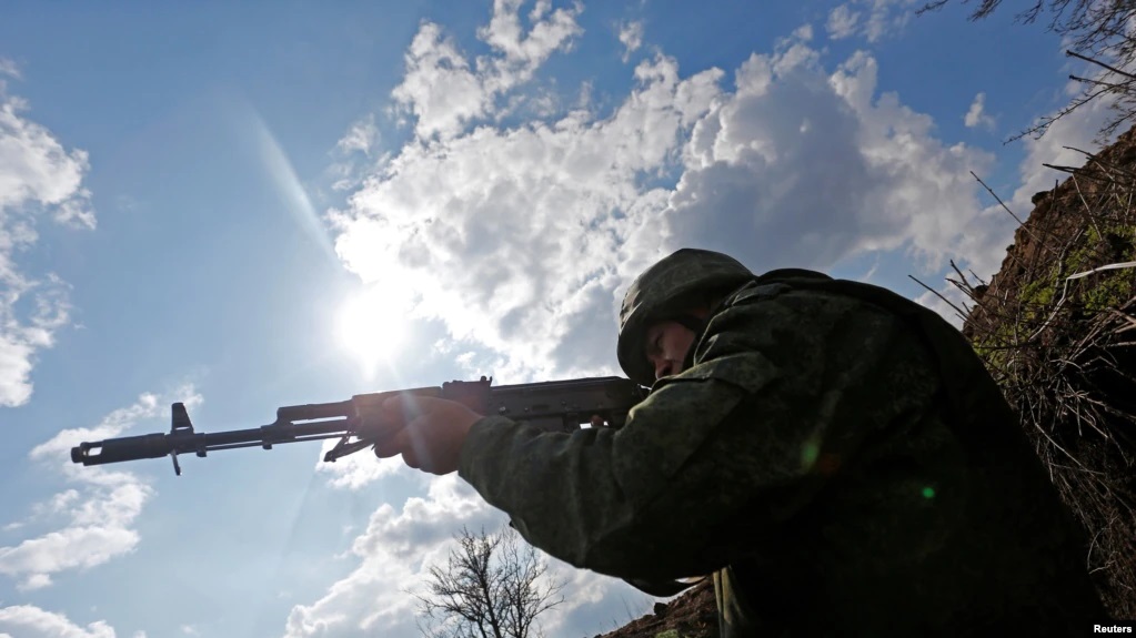 在盧甘斯克與烏軍相對峙的分界線附近,一位自稱宣布獨立的盧甘斯克武裝人士持槍瞄準對方陣地。-資料照
