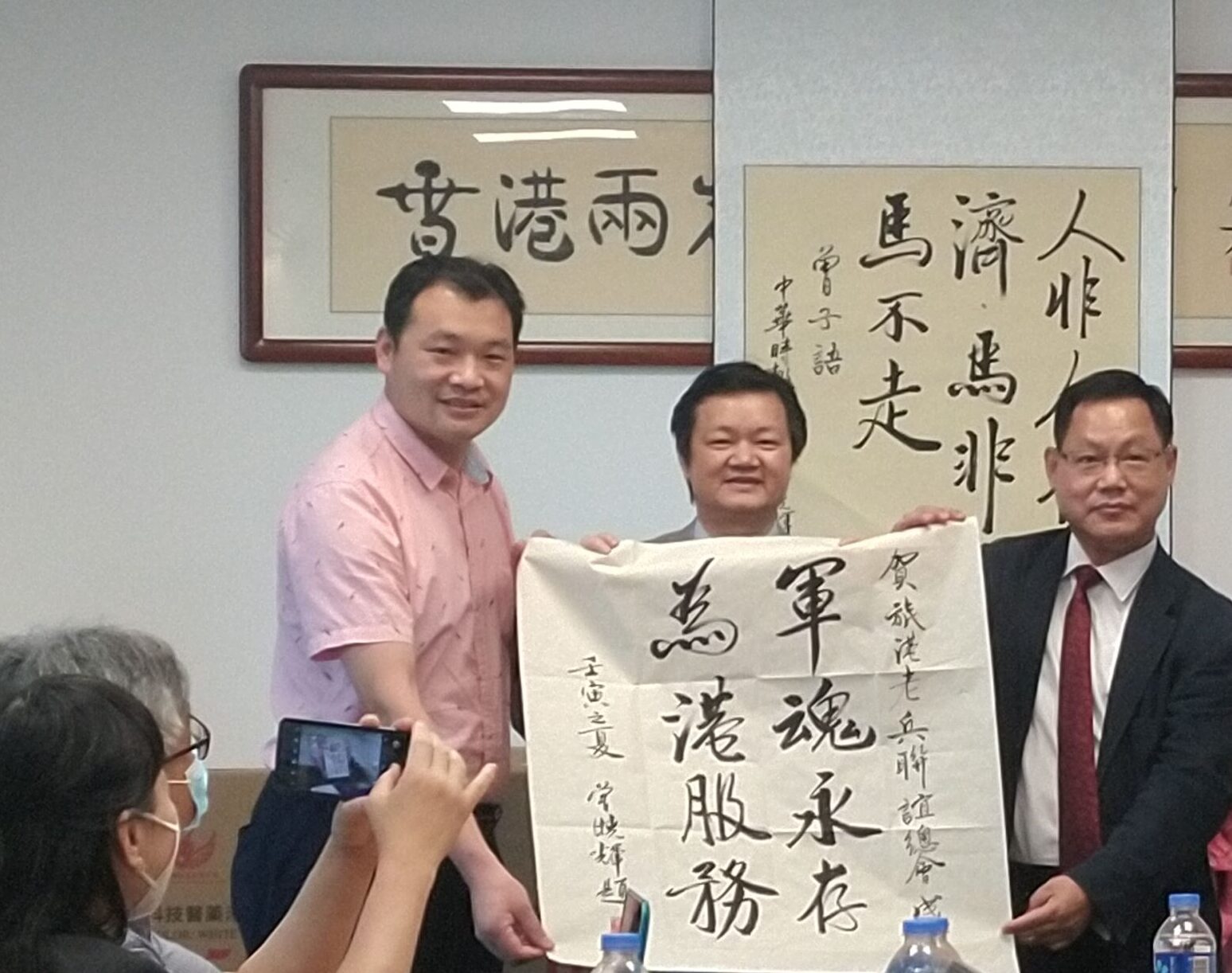 3 中華時報社長曾曉輝贈他題寫的書法給「旅港老兵聯誼總會」儀式。