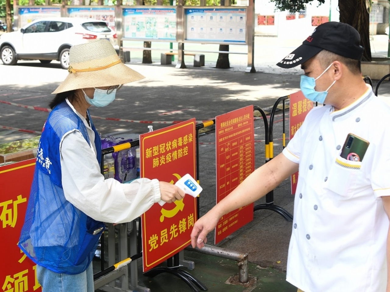 在海口市一個核酸採樣點,工作人員為市民測量體溫。(新華社資料圖片)