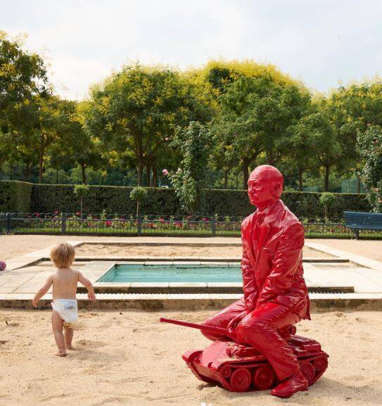根據CNN報導,這座雕像是在本月1日晚間突然出現的,清楚可見該雕像呈現亮紅色,普京神情肅穆地屈膝坐在小型的坦克車上,佈滿著土黃色的沙子;而他的身旁卻是一群天真無邪的孩子,圍繞著他玩耍。