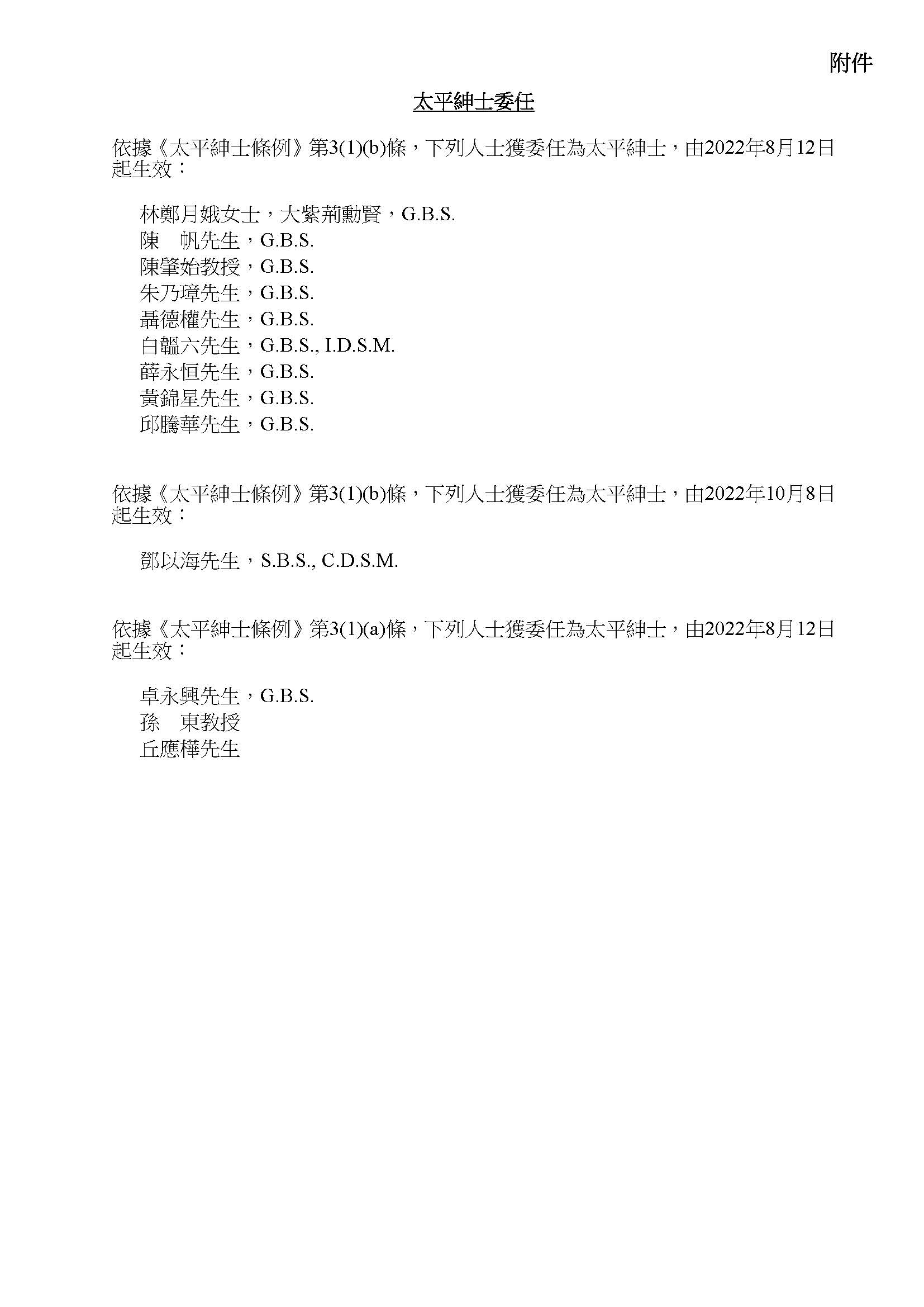 另外3人是官守太平紳士,分別是政務司副司長卓永興、創新科技及工業局局長孫東、商務及經濟發展局局長丘應樺。