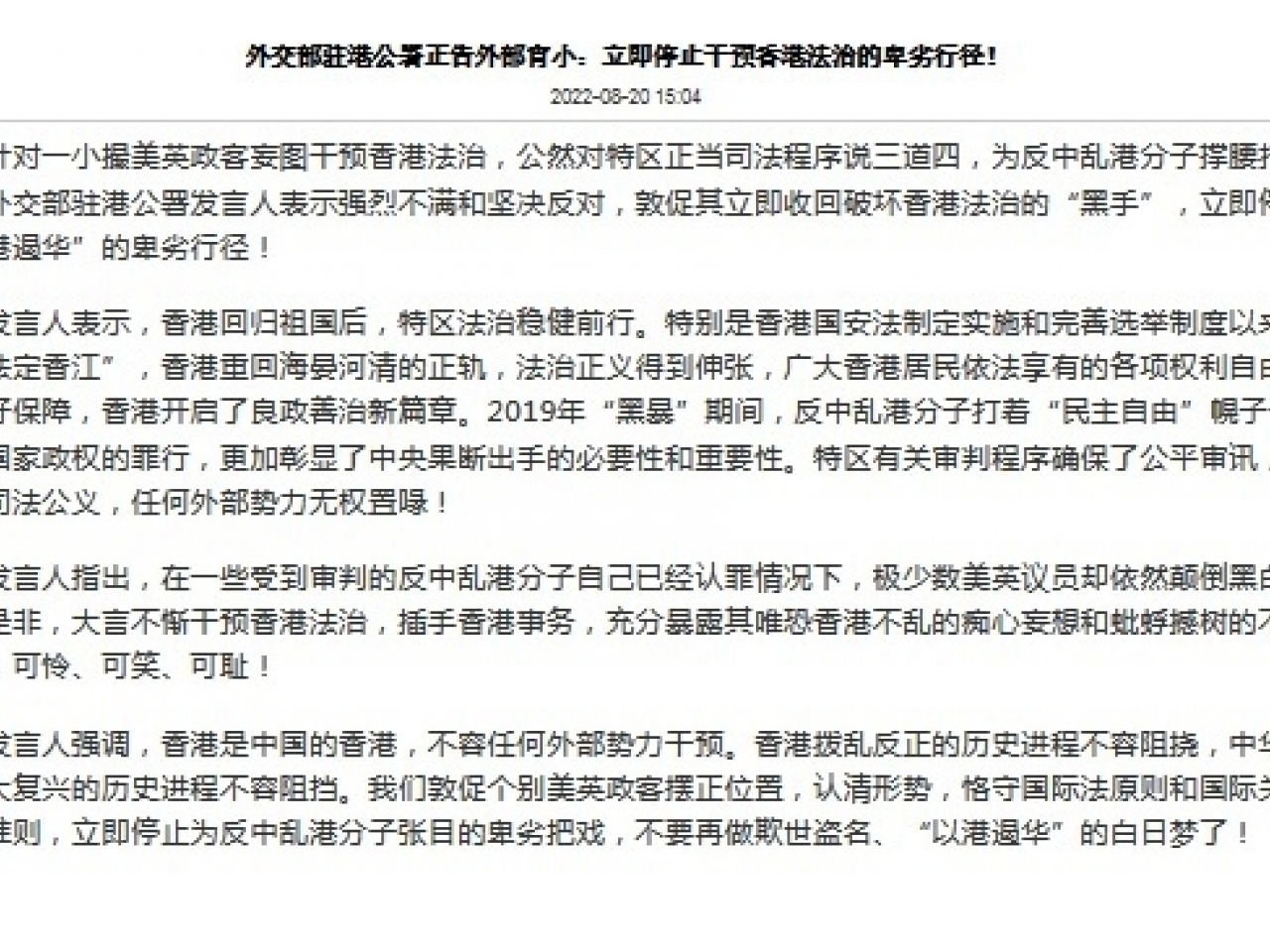 外交部駐港公署發言人說,一小撮美英政客妄圖干預香港法治,公然對特區正當司法程序說三道四,為反中亂港分子撐腰打氣,公署表示強烈不滿和堅決反對,敦促立即收回破壞香港法治的黑手,立即停止亂港遏華的卑劣行徑。