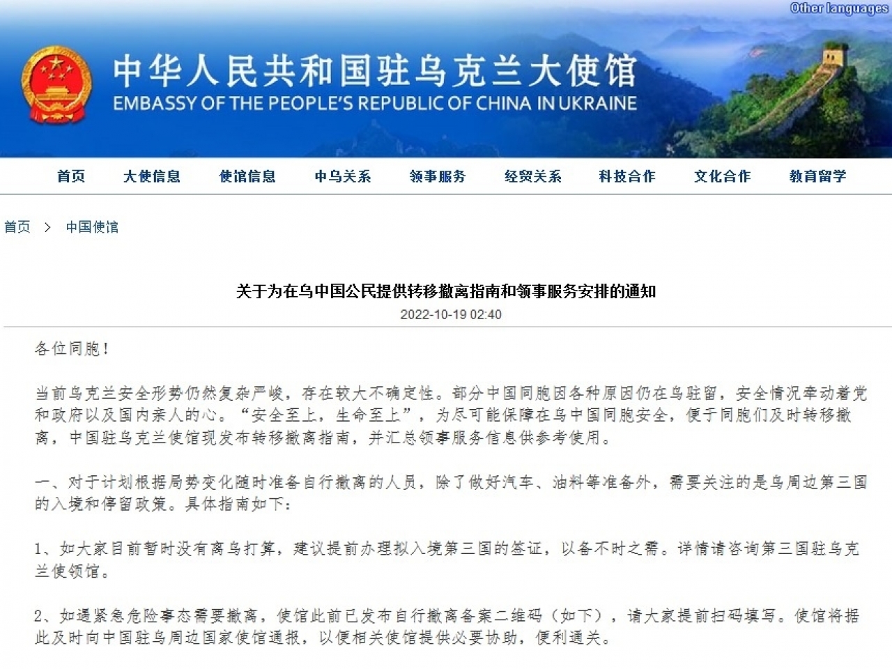 大使館官網發布消息表示,對於計劃根據局勢變化隨時準備自行撤離的人員,除了做好汽車、燃料等準備外,需要關注的是烏克蘭周邊第三國的入境和停留政策。並列出一系列具體指南,包括如果目前暫時沒有離開烏克蘭的打算,建議提前辦理打算入境第三國的簽證,以備不時之需。