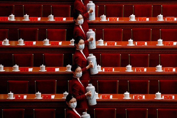 2022年10月16日北京人民大會堂舉行中共二十大開幕式前,女服務員爲代表們提供茶水。