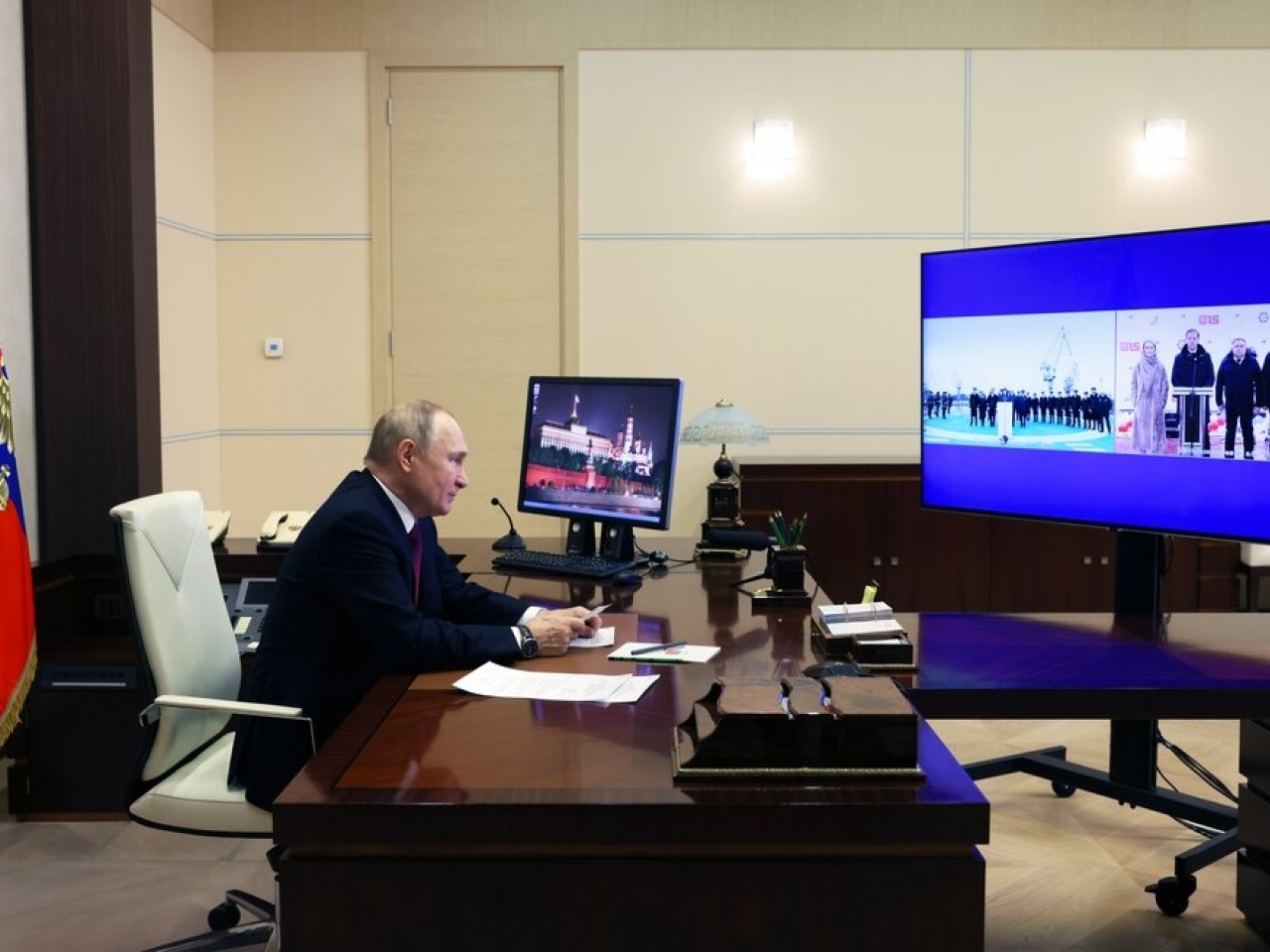 俄羅斯總統普京在克里姆林宮以視像方式,為兩艘核動力破冰船主持升旗和船塢下水儀式。