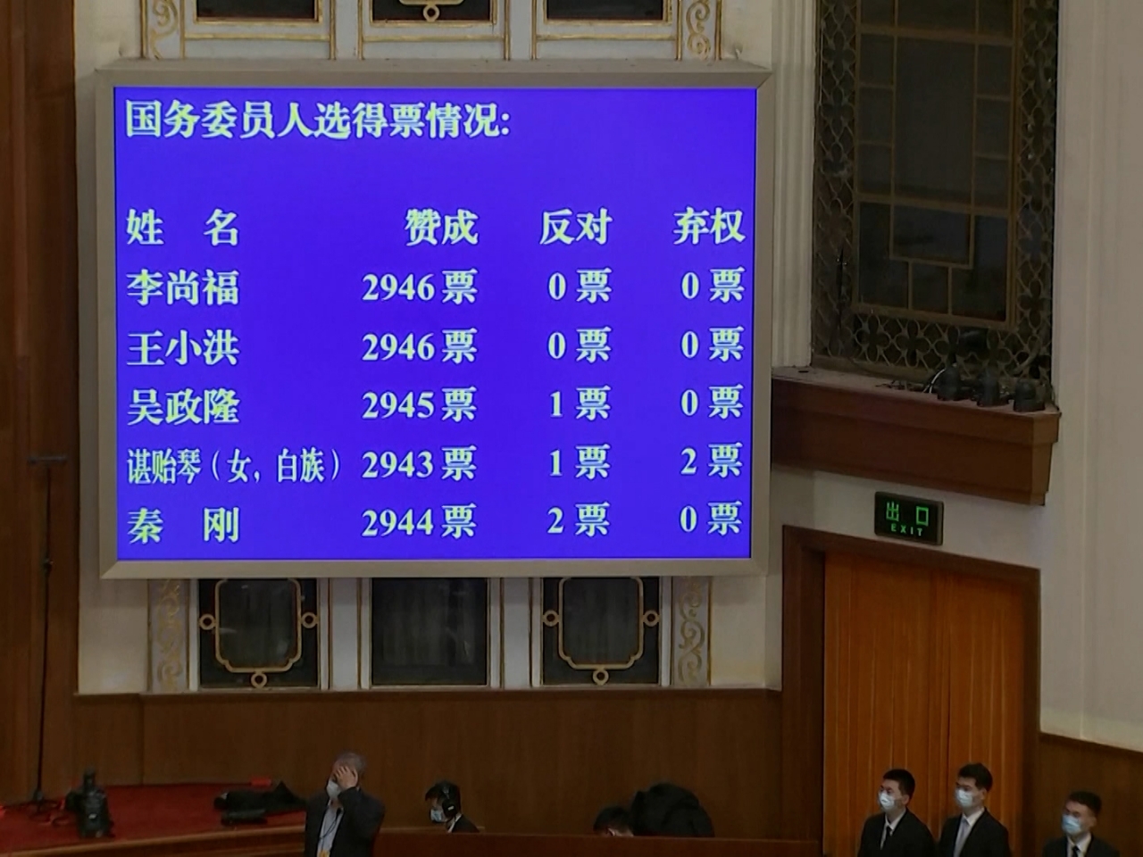 李尚福和王小洪分別取得全部2946票贊成;吳政隆有1票反對;諶貽琴有1票反對、2票棄權;秦剛則有2票反對。