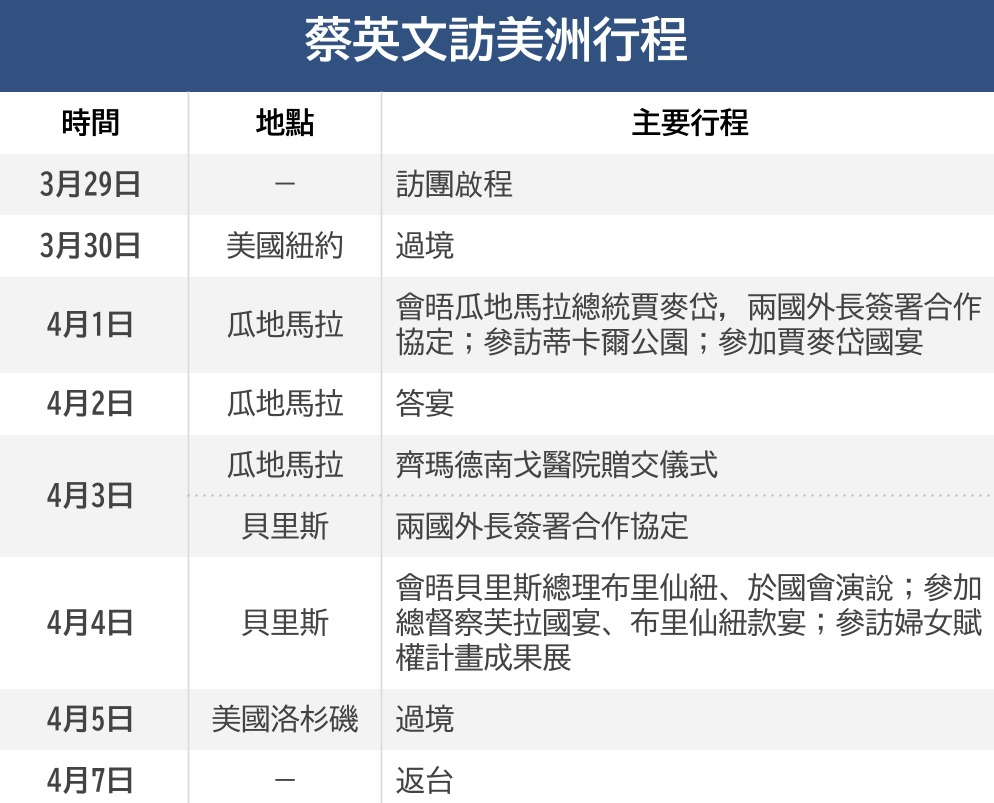 (中華新聞通訊社/中華時報3月29日訊)台灣總統蔡英文於週三(29日)率團出訪,展開為期10天9夜的「民主夥伴共榮之旅」,除了訪問中美洲台灣邦交國瓜地馬拉、貝裡斯之外,去程及回程也會過境美國紐約、洛杉磯並分別待2夜。