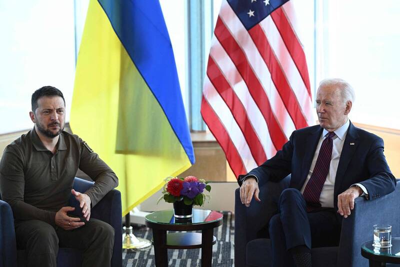 烏克蘭總統澤連斯基(中)受邀出席七大工業國集團(G7)領袖峰會,引發廣島原爆後代、反核武團體不滿。(美聯社)