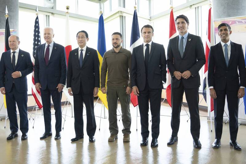同日,G7領袖在澤連斯基抵日後隨即發表聲明,誓言支持烏克蘭「絕不動搖」,將持續提供烏克蘭所需的財務、人道、軍事與外交支援;聲明中也譴責俄羅斯,強調不容許俄國威脅使用與使用核武、警告第三國停止對俄提供武器等物資支援,以免「付出沉重代價」,以及主張和平方案應納入俄國完全與無條件撤軍,藉此與中國稍早提出、內容不含要求俄國撤軍的和平方案抗衡。