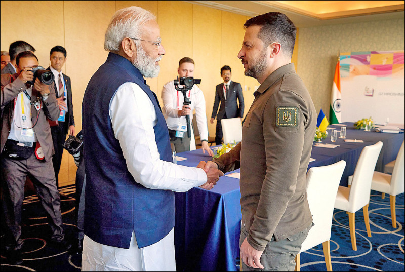 非G7成員但皆受邀出席G7領袖峰會的烏克蘭總統澤連斯基(右)與印度總理莫迪(左)廿日在場外會晤。(法新社)