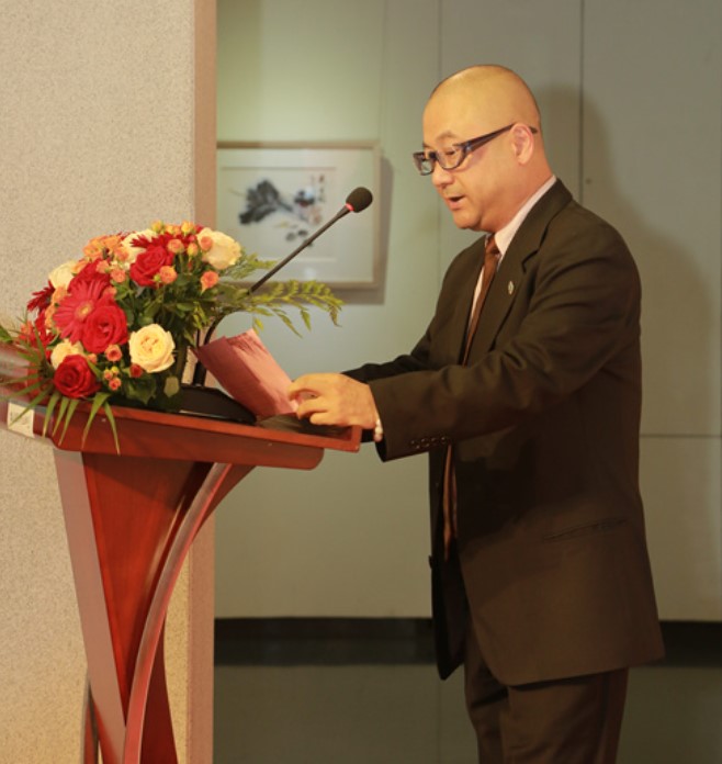 主禮剪彩嘉賓:(由左到右)廣州醫科大學原黨委書記翁宗奕教授、廣東省流行音樂協會主席高翔、新華社香港分社原社長俱孟軍、中國書畫家聯誼會原駐廣州辦事處主任孫偉民、音樂家陳小奇、國際城市文化論壇組委會主席曾曉輝教授、解放軍總政聯絡部原副部長藍曉石將軍、聯合國NGO太平洋地區發展與教育組織亞太區總幹事長趙元洪、江蘇省美術家協會原副主席尹石、香港美術學院副院長全心教授。