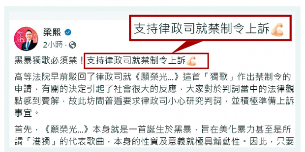 當局申請《榮光》禁令被法院駁回後,有報道指律政司傾向上訴。多名議員周五表態支持政府上訴,民建聯梁熙指出,有關判決引起社會很大反應,「大家對於判詞當中的法律觀點感到費解」,又認為判詞指禁令容易導致一罪兩審,是「忽略了維護國家安全本身就具有凌駕一切的地位」,並指律政司需要透過上訴讓法庭釐清案中含糊不清之處。